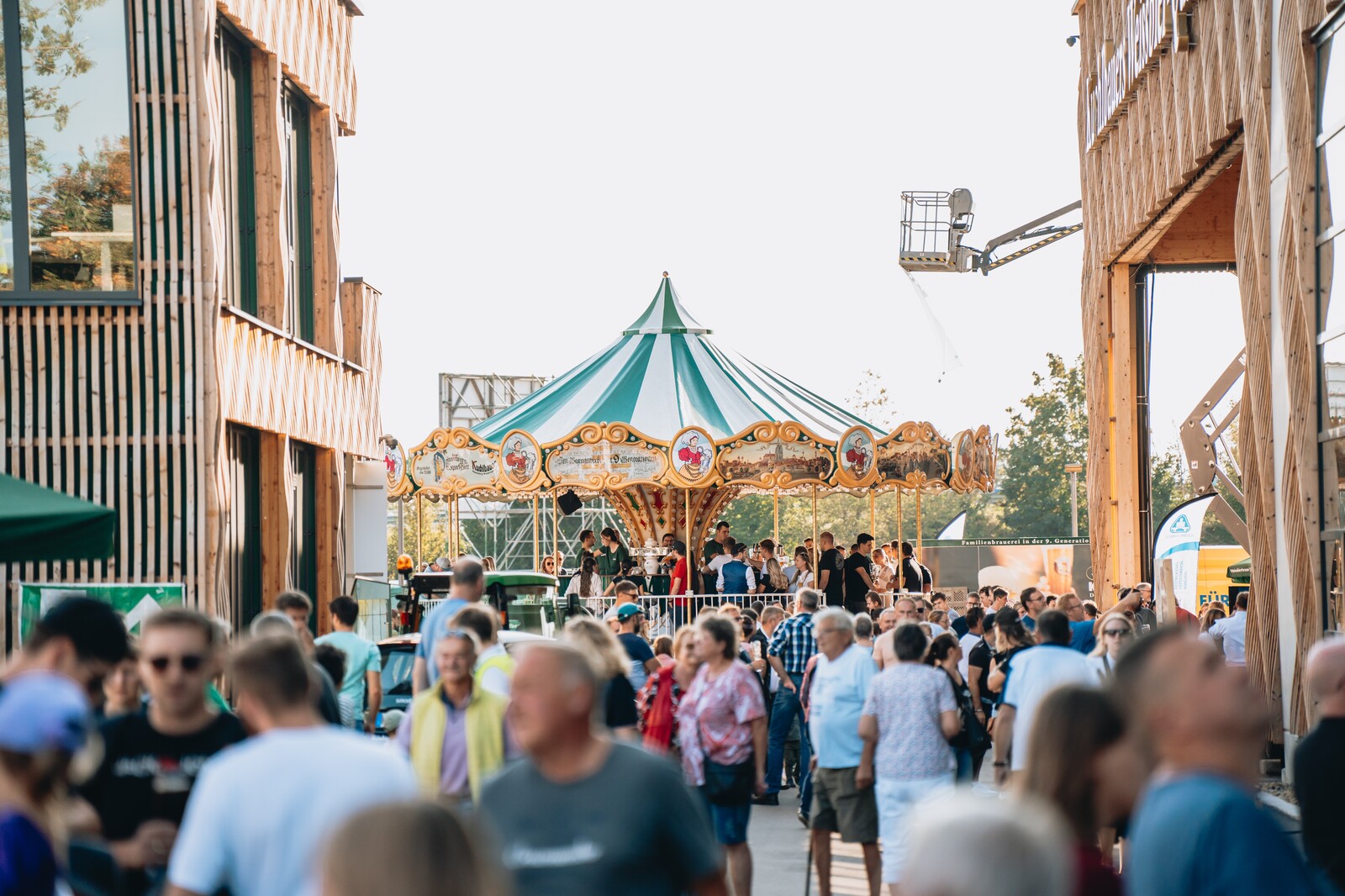Um 12:30 Uhr öffneten sich die Tore des Logistikzentrums für den Tag der offenen Logistik. Besucherinnen und Besucher konnten bei bestem, spätsommerlichem Wetter ein abwechslungsreiches Rahmenprogramm genießen, das für Jung und Alt etwas zu bieten hatte. Höhepunkte waren unter anderem eine Fahrzeugausstellung der Firma Stanglmeier mit einem Baggersimulator, ein Kindermitmachzirkus sowie die interaktiven Präsentationen der am Bau beteiligten Gewerke. So stellte beispielsweise die Zimmerei Meier einen Prototypen der Wandverkleidung aus, die auch an der Fassade zu sehen ist. Die Firma linde bot auf Staplersimulatoren Probefahrten an.