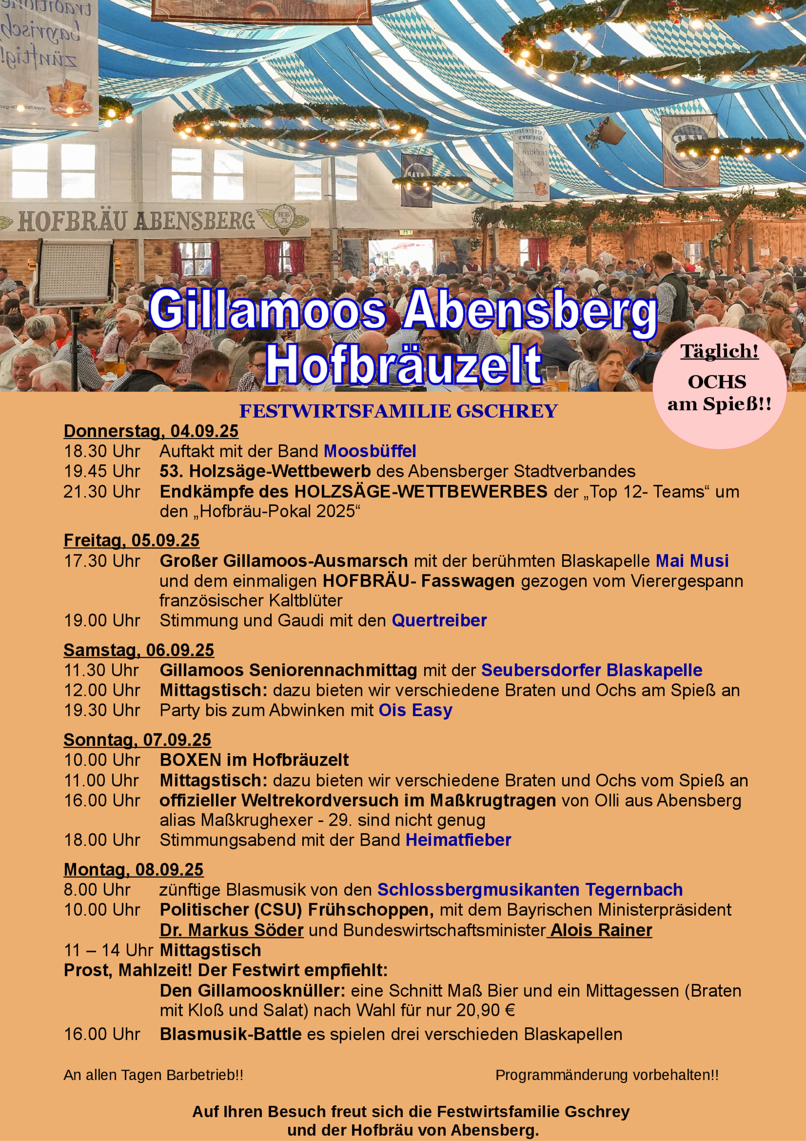 ...erlebt Ihr im Hofbräuzelt. Bekannte Stimmungsmacher rocken an den Abenden die Bühne. Der Junior-Hofbräu hat allerdings auch ein Gespür für Geheimtipps und präsentiert gerne ausgewählte Newcomer. Mit dem Wuidstock-Festival im Hofbräu-HopfenBiergarten ist der Gillamoos um etwas Festivalatmosphäre reicher.
