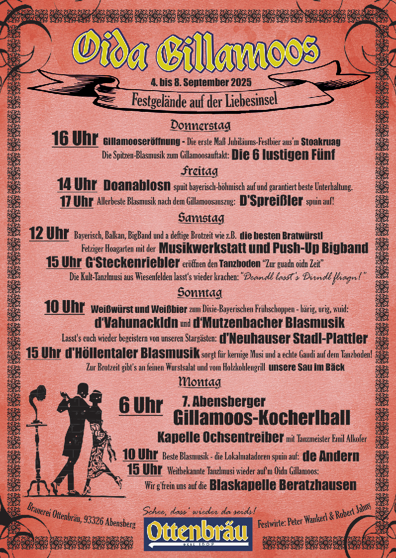 Der kleine historische Festbereich auf der Liebesinsel lädt Euch zu einem Ausflug in längst vergangene Zeiten ein. Bei unverstärkter, echter Blasmusik genießt Ihr Eure Maß aus dem Steinkrug und a gscheide Brotzeit. Am Tanzboden können Freunde des Volkstanzes sauber die Dirndl fliegen lassen. Dazu findet ein Handwerker- und Warenmarkt auf'm Oidn Gillamoos statt, dort findet Ihr Kunsthandwerk, Dekoration, Gartenzubehör und Schmuck in zauberhafter Umgebung.