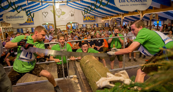 Fans feuern Sagler beim Holzsägewettbewerb an.