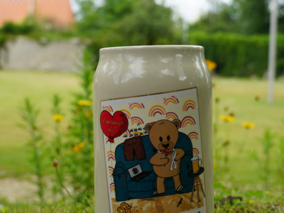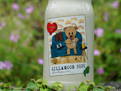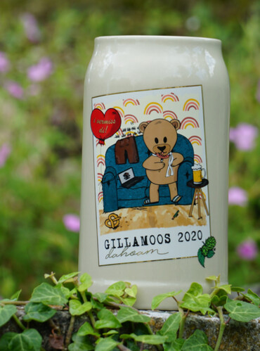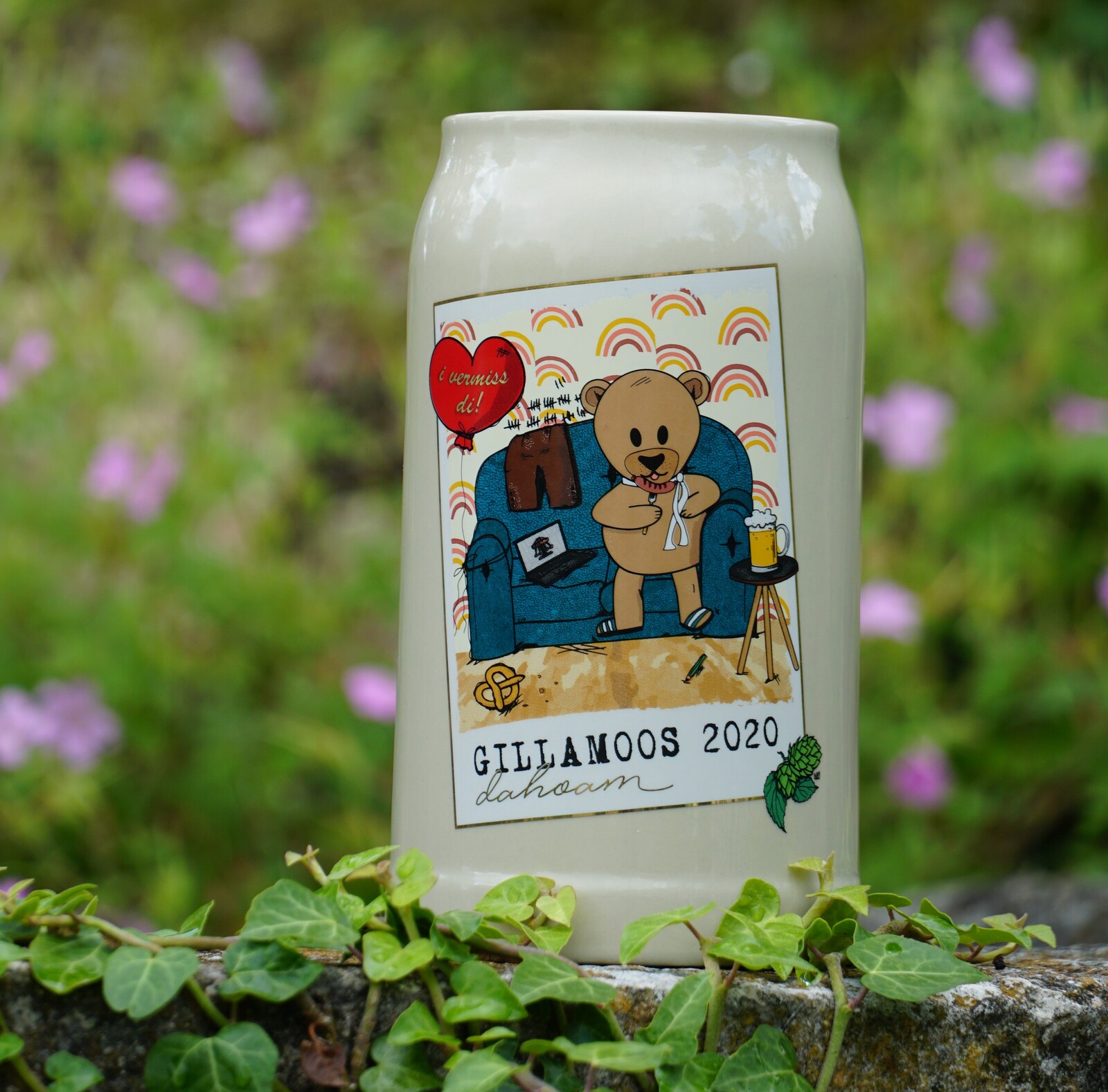 Doch gerade die Umstände machen den Maßkrug so besonders. Passend zum Gillamoos Dahoam gab die Stadt den Krug dieses Jahr in Auftrag. „In normalen Zeiten wäre dieses Motiv undenkbar gewesen,“ sagte Designerin Maria März, die seit ein paar Jahren die Krugmotive gestaltet. „Aber jetzt, da wir alle unseren Gillamoos dahoam organisieren, sitzt eben auch der Bär daheim auf dem Sofa.“ Die Designerin erstellte von ihrem kreativen Prozess der Gestaltung einen Zeitraffer, den es auf der Webseite zu sehen gibt. „Da sieht das Ganze natürlich sehr viel einfacher aus, als es ist. Vor allem der Weg von der Ideenfindung bis zur Umsetzung verläuft manchmal langwierig. Es muss eben alles passen, da arbeite ich an einigen Details auch schon mal länger hin“, berichtet Maria von ihrem Schaffensprozess. Sie hat das Motiv von der Druckerei Kelly farbecht drucken lassen und auf einen neutralen Steinkrug der Firma Herb geklebt, um dann gemeinsam mit der Gillamoosheft-Redaktion zu prüfen, wie es wirkt. Erst danach folgten dann die finalen Änderungen. Die Goldapplikationen kamen beispielsweise hier erst erst dazu. Sie machen das Motiv zum absoluten Hingucker. Für Sammler machen Sie den Krug noch attraktiver.