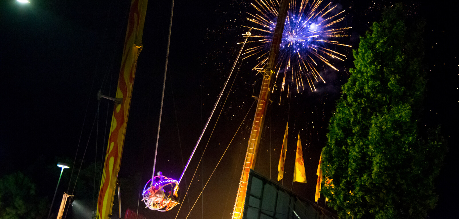 Sobald die Kugel die 50 m erreicht hat setzt die Schwerkraft ein und stürzt im freien Fall kopfüber in die Tiefe. Während des Flugs schlägt die Kugel zahlreiche Loopings und das völlig schwerelos.