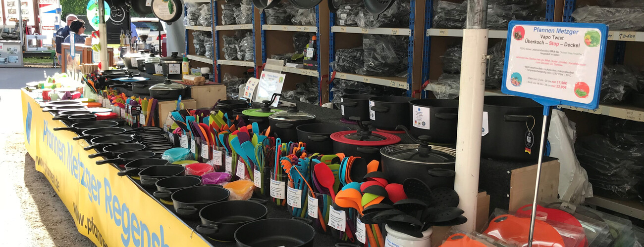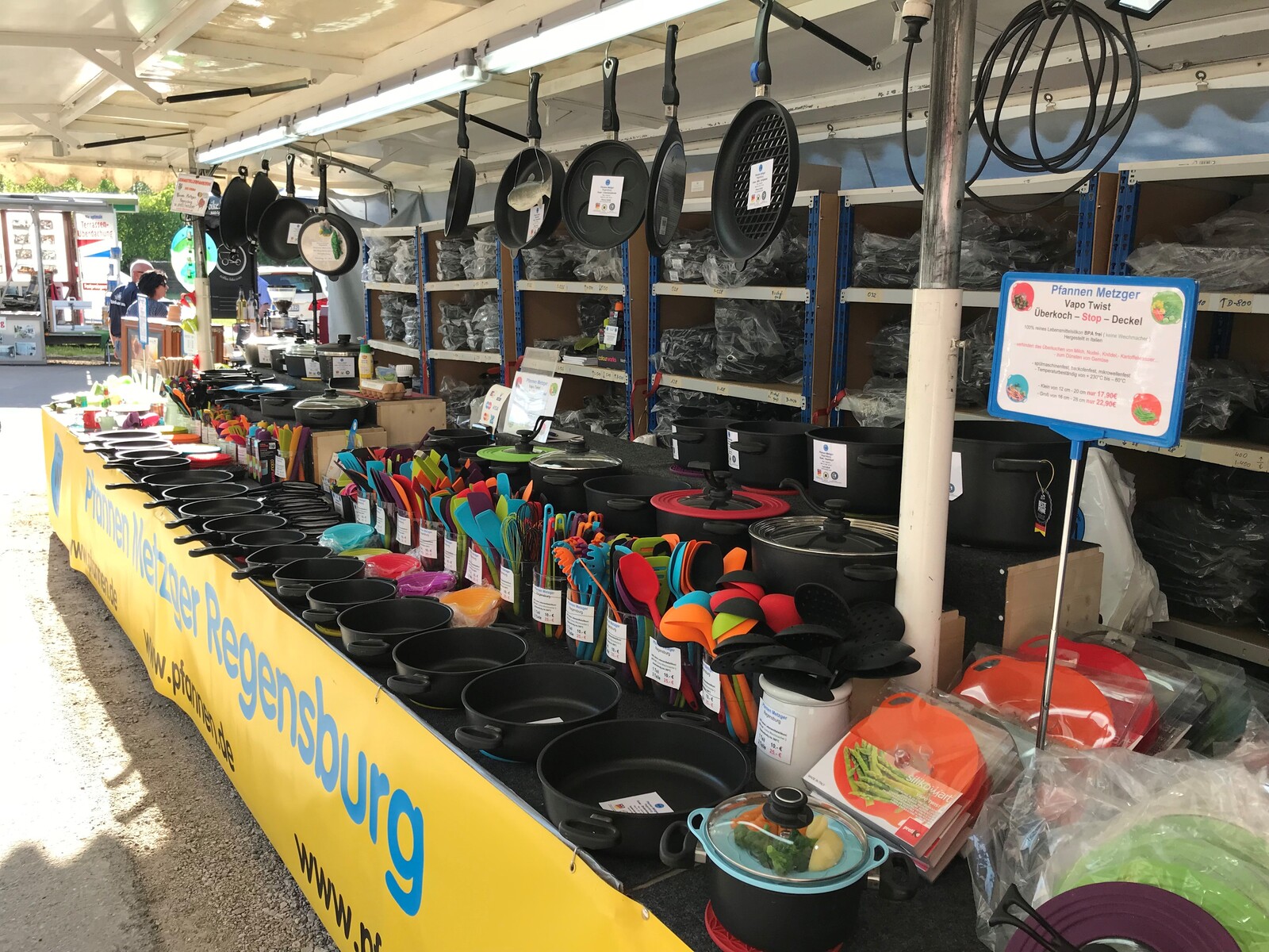 Bekannt seit Jahren vom Gillamoos in Abensberg! Pfannen, Töpfe, Bräter, Bratrainen, Backformen, Silikonzubehör, Bratdeckel, Überkochstopdeckel, Silikondeckel, Glasdeckel … Alle Pfannen und Töpfe sind auch für Induktion erhältlich.