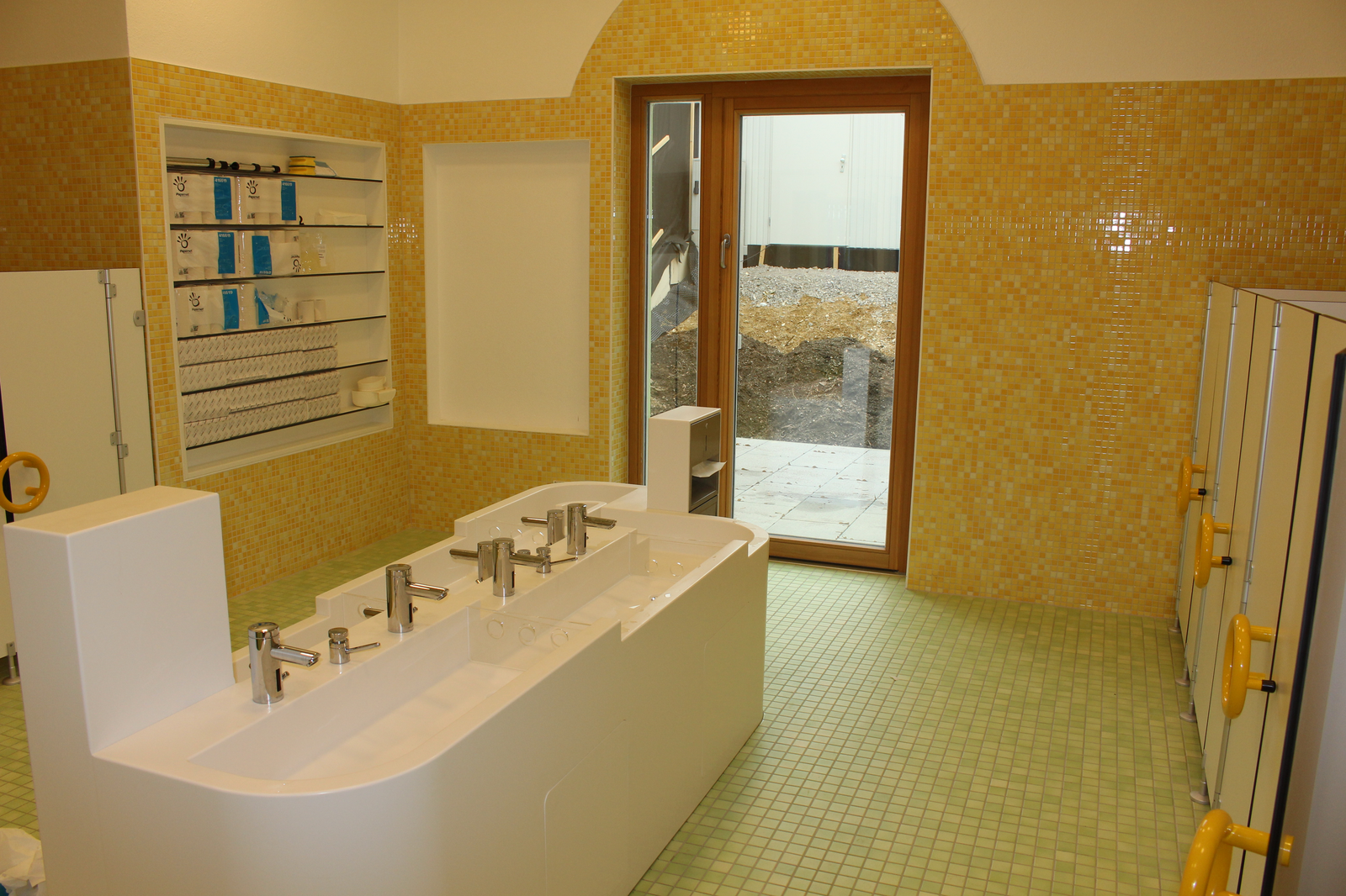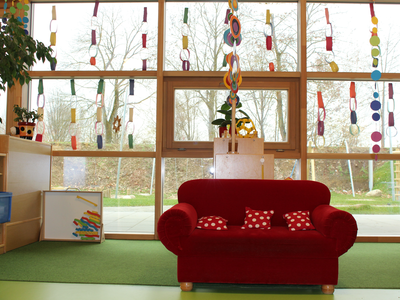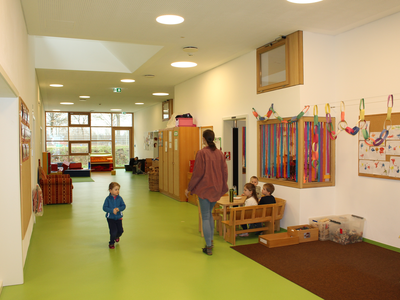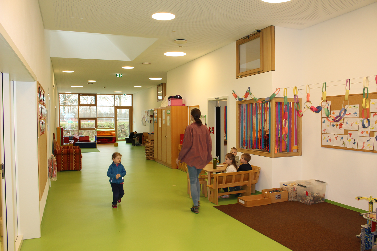 Das Haupthaus am Freibadweg besteht aus drei Gruppen. Der Kindergarten bildet eine zentrale Garderobe und einen gemeinsamen Waschraum. Die großzügigen Gruppenräume bieten den Kindern viel Platz und Freiraum für Gestaltungsmöglichkeiten. Sie laden die Kinder durch ihr vielfältiges und ansprechendes Material zum Selbertun, Entdecken und sich Entfalten ein. Je nach Interesse und Bedürfnis können die Kinder auch selbst entscheiden, wo sie spielen möchten. Möglichkeiten dazu gibt es in unserem großen Bewegungsgang. Verschiedene Spielecken können von allen Gruppen genutzt werden. Jedem Gruppenzimmer ist ein Intensivraum zugehörig. Die großen Fensterfronten lassen die Räume hell und freundlich wirken. Zusätzliche Containeranbauten beherbergen zwei weitere Kindergartengruppen und eine Nachmittagsgruppe. Auch dort steht den Kindern eine zentrale Garderobe und ein gemeinsamer Waschraum zur Verfügung. Die Gruppen verfügen über einen angrenzenden Intensivraum, sowie über einen Spielgang, welcher gruppenübergreifend genutzt werden kann. Die Gruppen sind mit einem Übergang zum Haupthaus verbunden. Zusätzlich haben wir einen Bewegungsraum, der täglich einer anderen Gruppe zur Verfügung steht. In dem angegliederten Garten, in dem sich ein Spielplatz mit Matschanlage, Rutsche und Schaukel befinden, haben die Kinder Platz zum Toben, Spielen m Entdecken und Verstecken