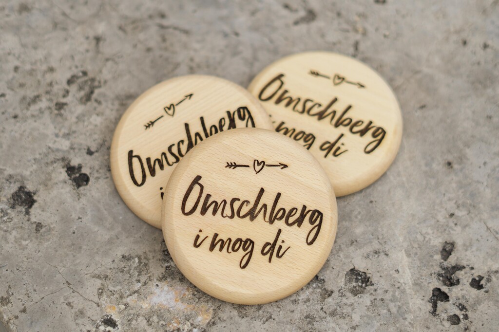 Bierdeckel aus massivem Buchenholz mit Gravur "Omschberg i mog di"