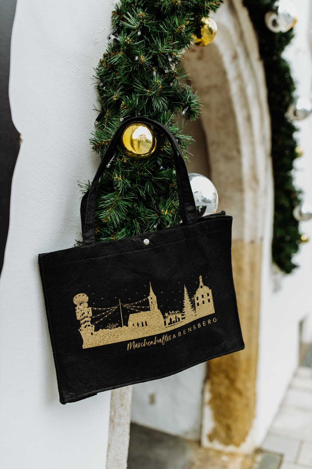 Vliestasche in schwarz mit wunderschönem Weihnachtsmotiv "Märchenhaftes Abensberg" und mittellangen Griffen.
