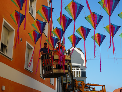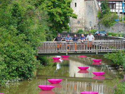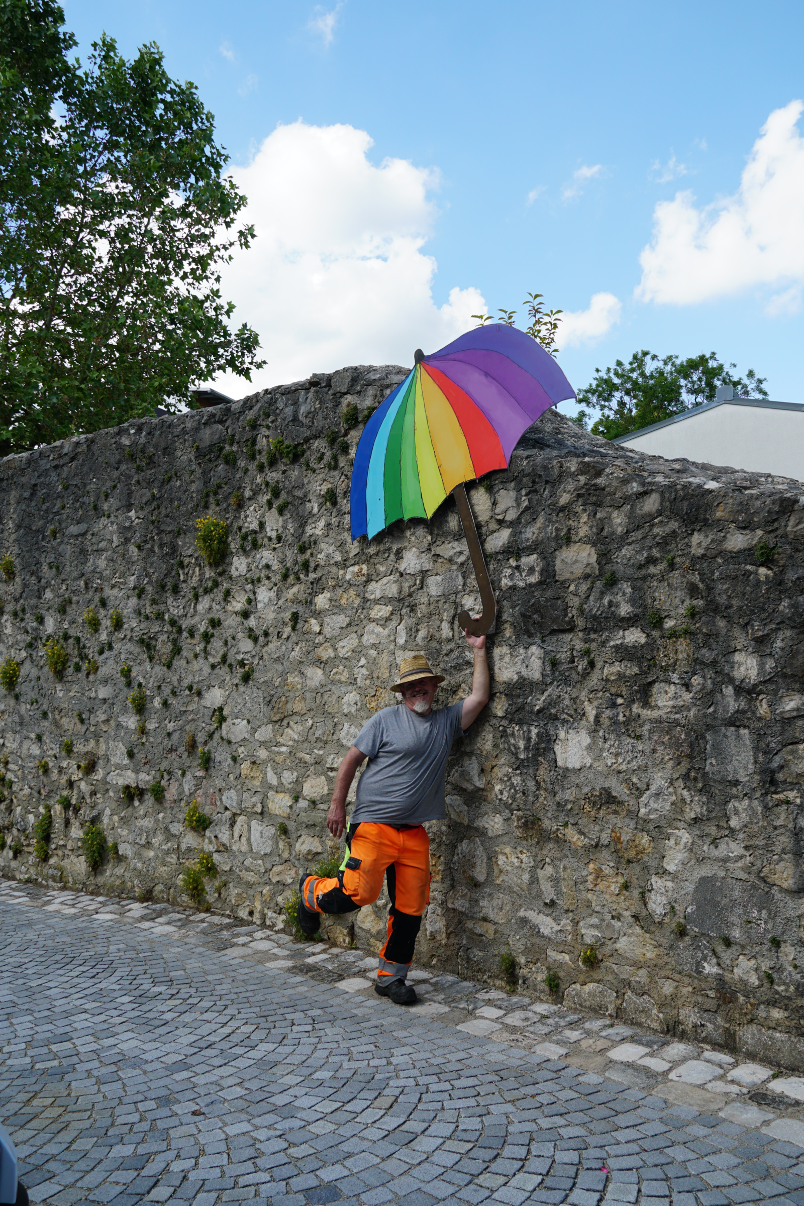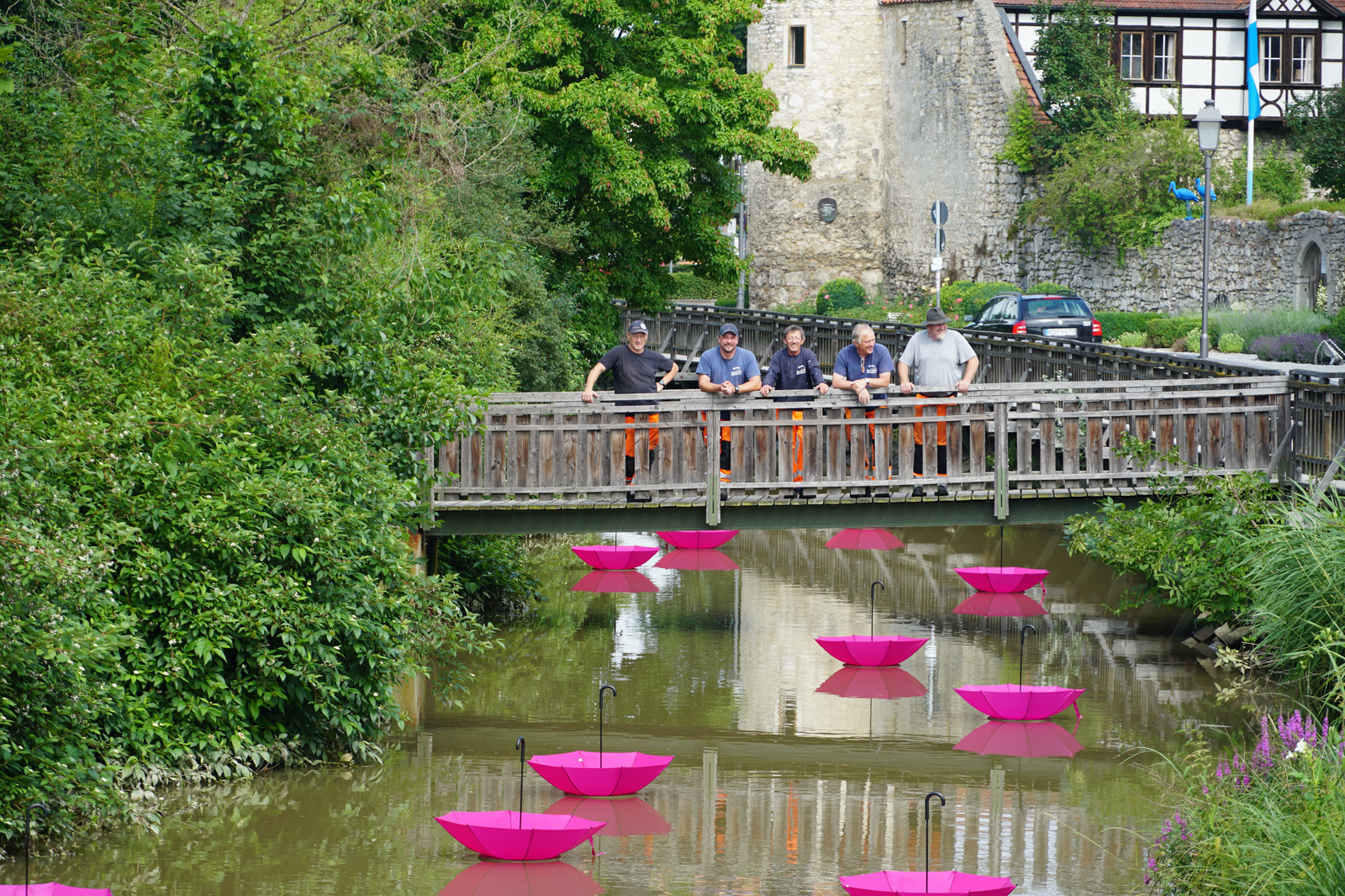 Ideen sind das eine. Aber irgendwer muss diese umsetzen. Dass dies manchmal ziemlich schwierig sein kann, haben wir in den letzten Wochen festgestellt. Wenn Schirme am Ende friedlich in der Abens schwimmen, sieht das kinderleicht aus. Aber bis sie das tun, gestaltet es sich ganz schön knifflig. Gebrauchsanweisung: Fehlanzeige. Google hilft wenig, obwohl es von kuriosen „How to“ Blogeinträgen und DIY-Videos im World Wide Web nur so wimmelt. Uns blieb als nur die ganz alte Schule: Probieren geht über Studieren.