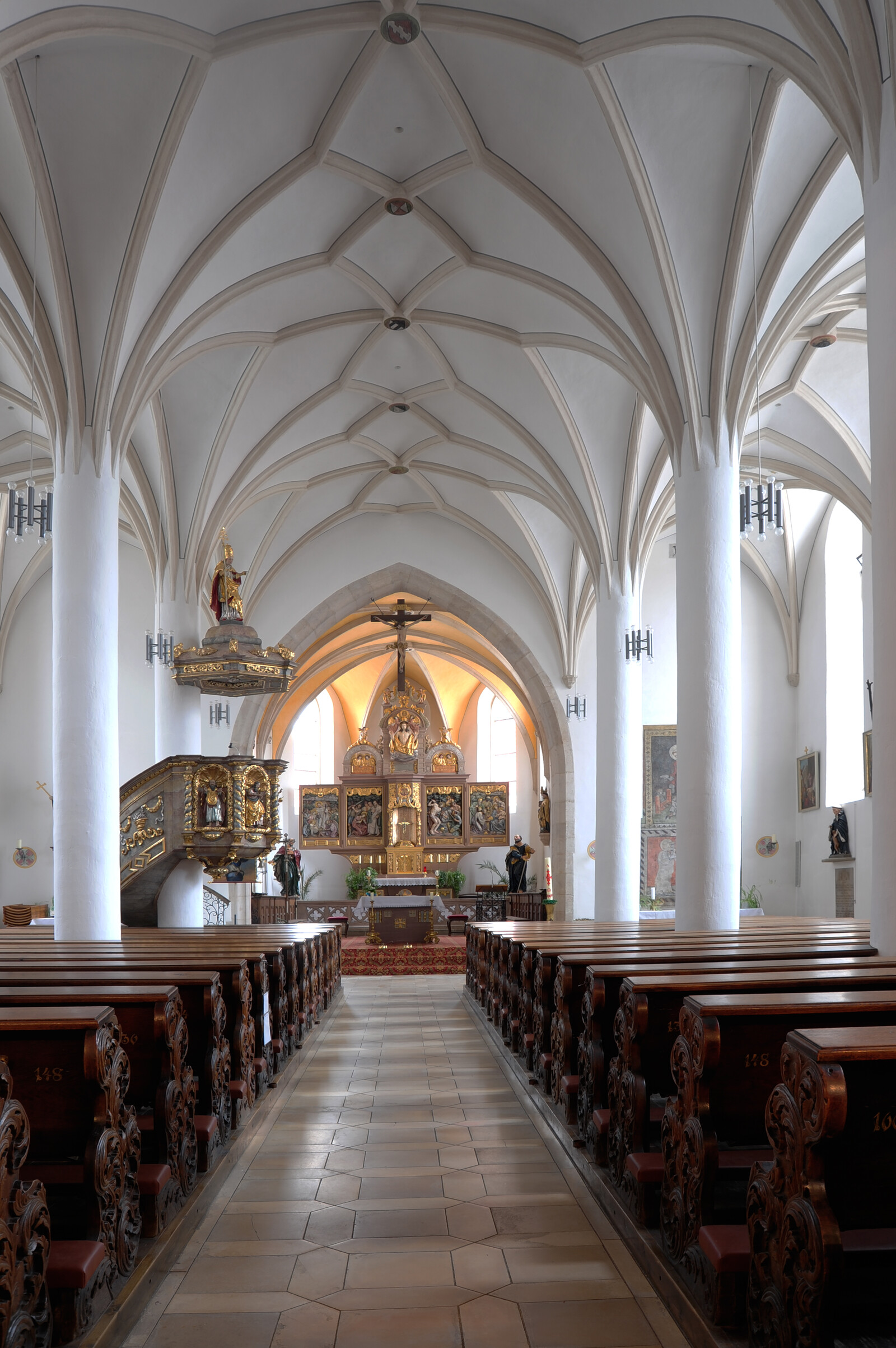 Der spätgotische Bau der Stadtpfarrkirche zeugt - wie der Bau der Klosterkirche - von der einstigen Bedeutung der Stadt. Bereits vor der Mitte des 15. Jahrhunderts begannen die Baumeister die Kirche zu errichten. Das belegt ein 1648 datierender Stein an der Stirnwand des Südseitenschiffes. Es dauerte allerdings Jahrzehnte, bis das Langhaus mit seiner Wölbung fertiggestellt war. Maurermeister Ludwig aus Pfeffenhausen beendete die lange Bauphase erst im Jahr 1516. Nachdem ein Blitzschlag den alten Turm zerstört hatte, erneuerte und erhöhte ihn der Baumeister Christoph Wolf aus Stadtamhof/Regensburg im Jahr 1762.